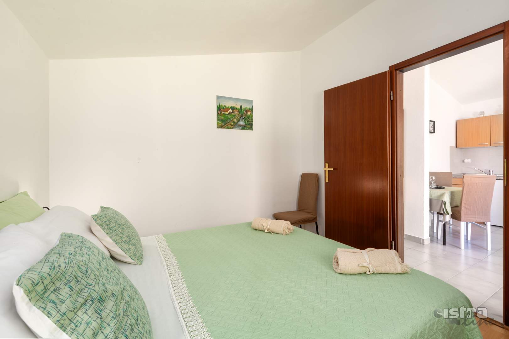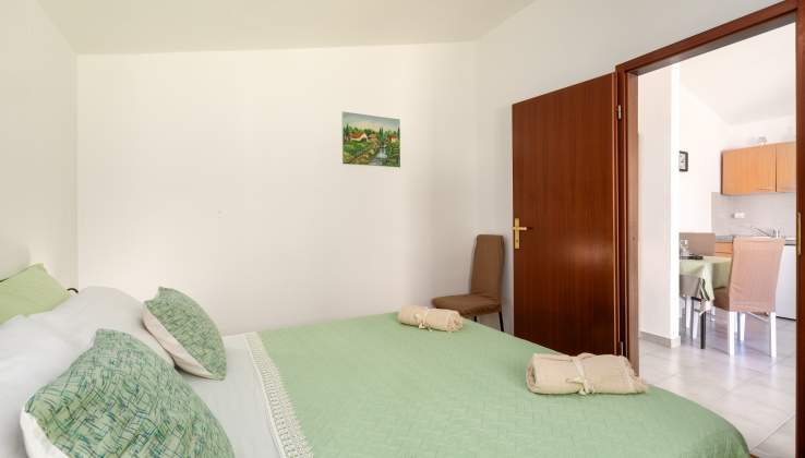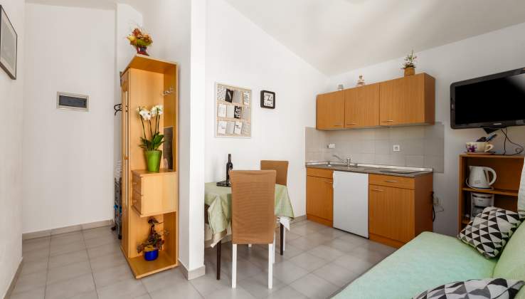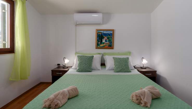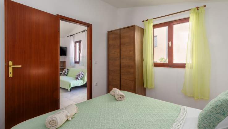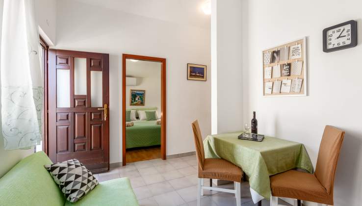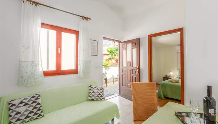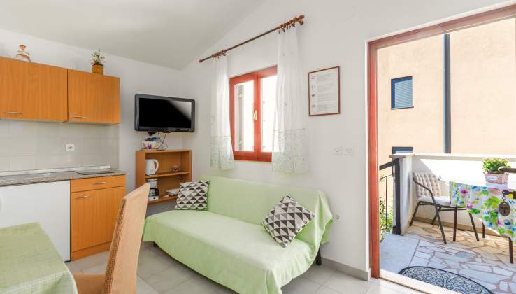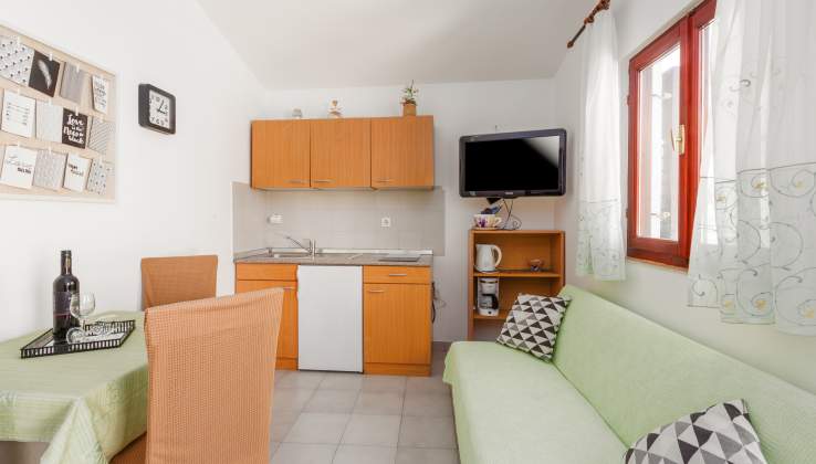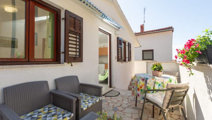 Apartment Rozi with a surface of 30m2 for  2 persons  is located on the first floor of the house and it consist of: a kitchen with dining table, one sleeping room with double bed, nice terrace with sitting set and bathroom with shower/toilet. Air condition and wireless internet are included in the price.