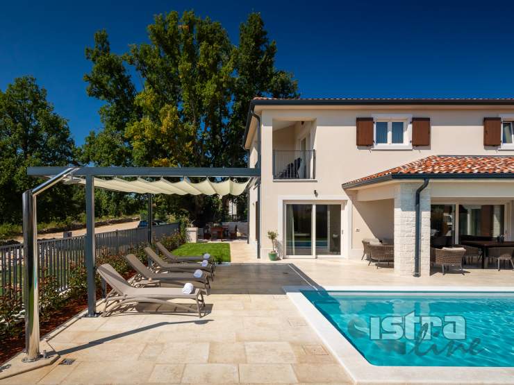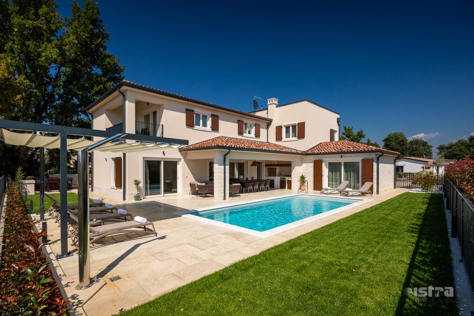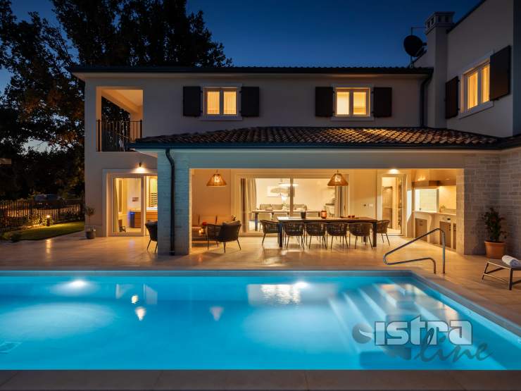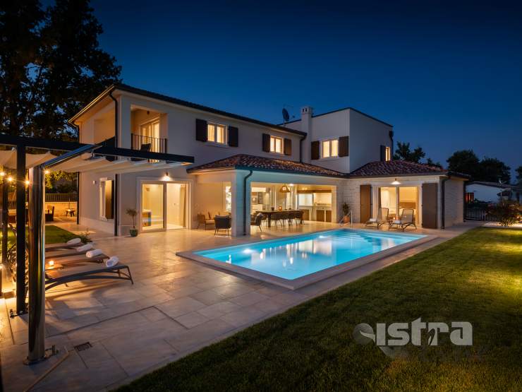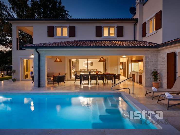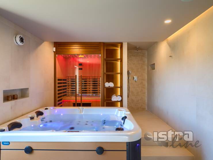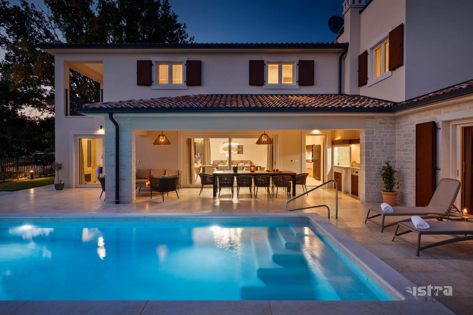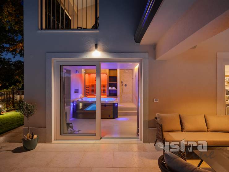 Luxury villa for 8 persons with swimming pool, whirlpool and sauna, near Porec and the beach with a panoramic view of the sea.