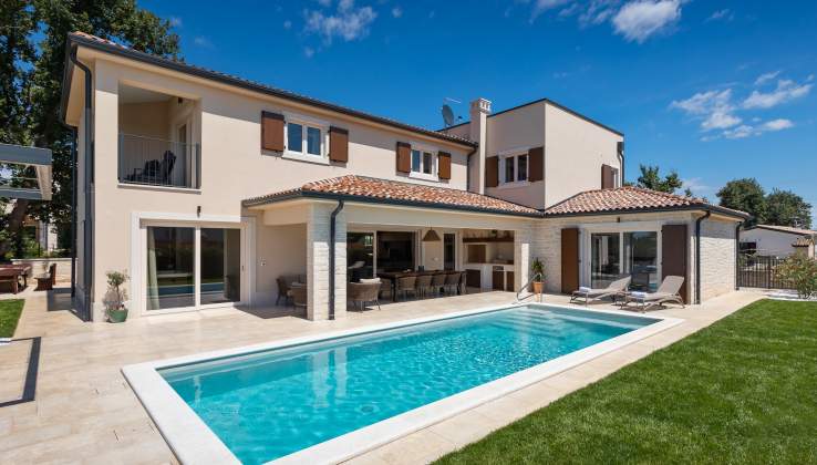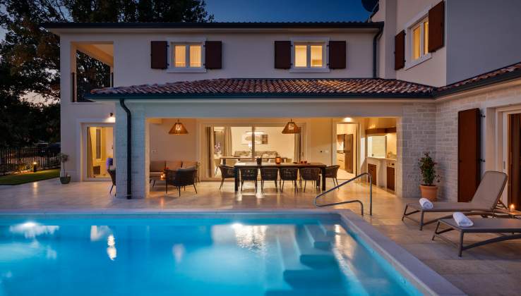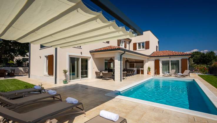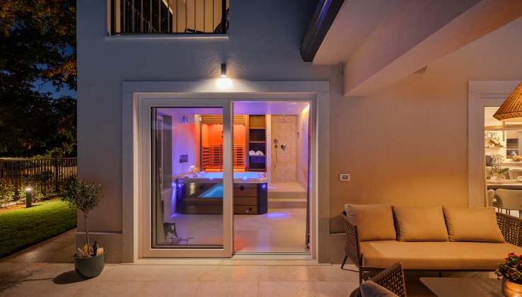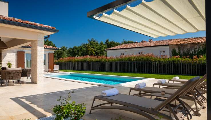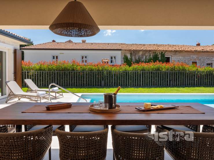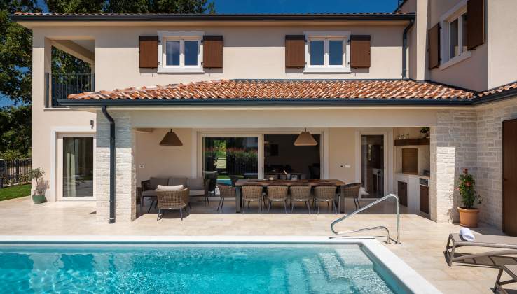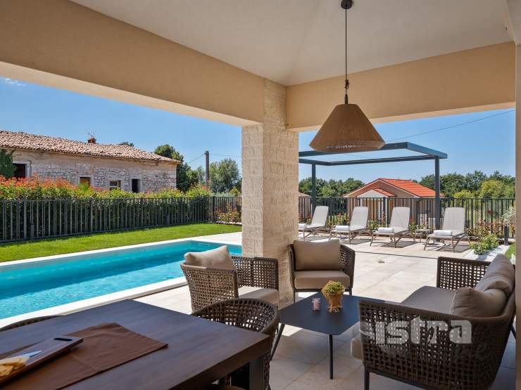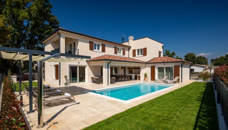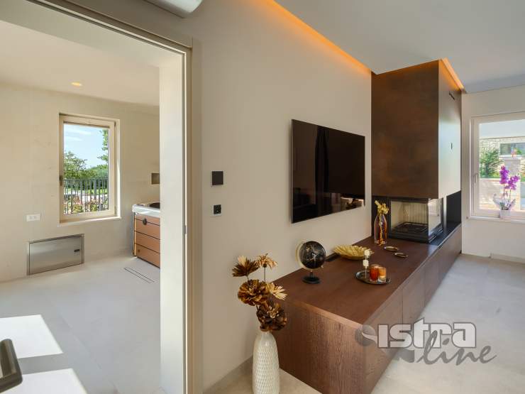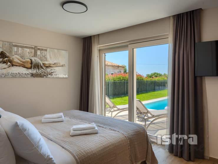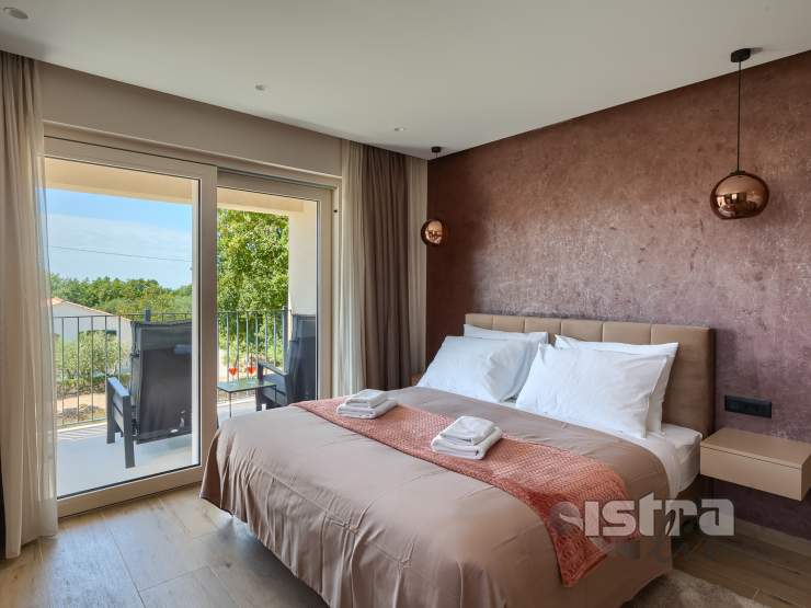 Luxury villa for 8 persons with swimming pool, whirlpool and sauna, near Porec and the beach with a panoramic view of the sea.