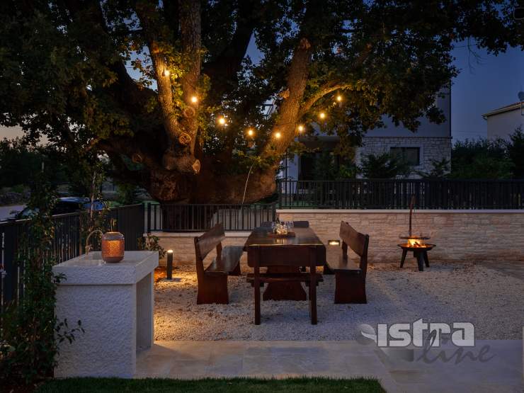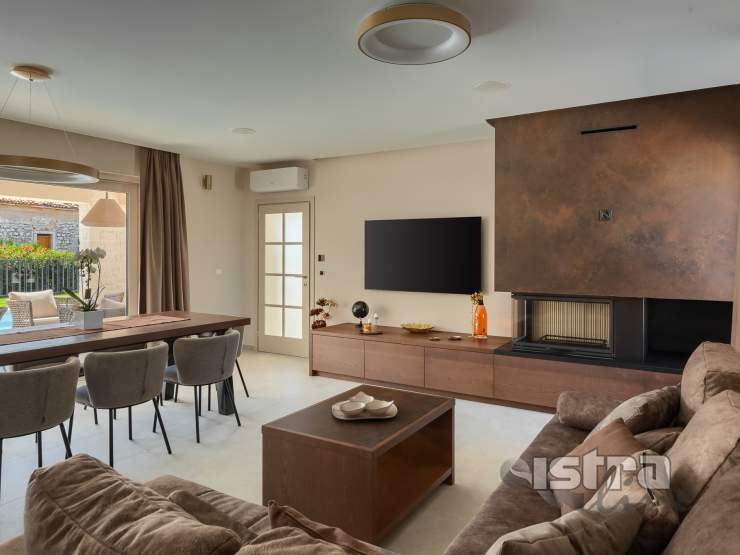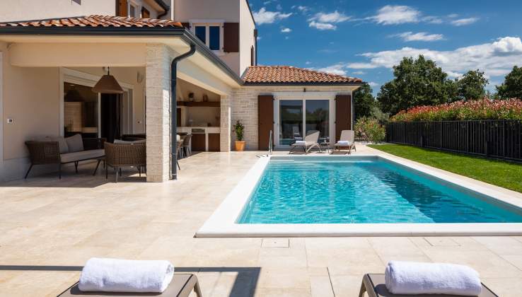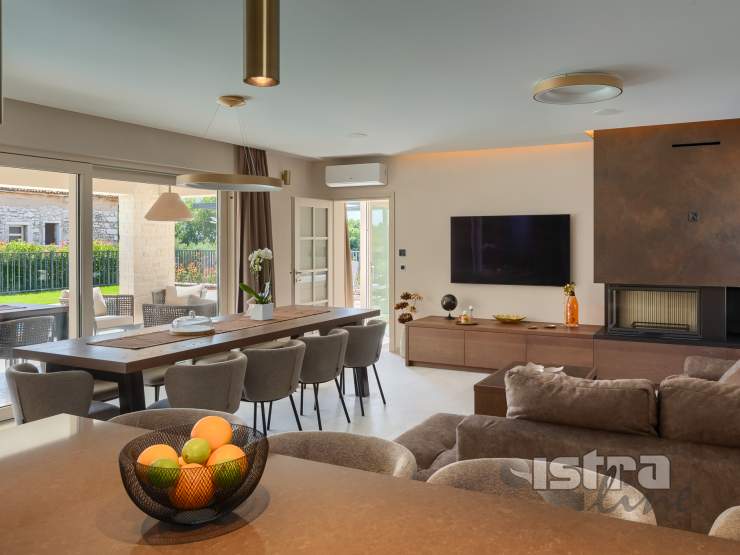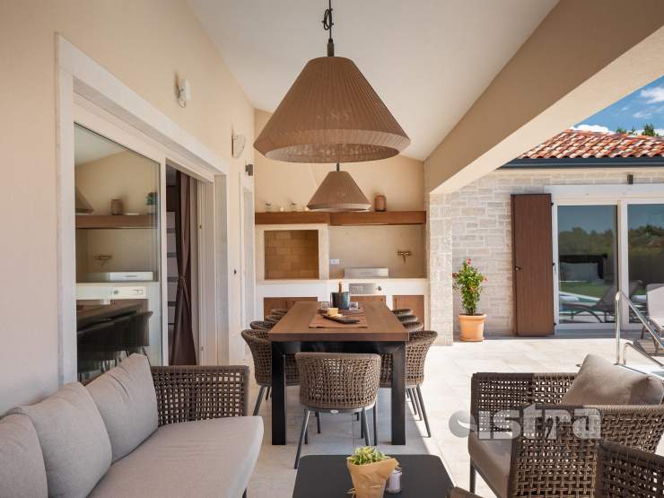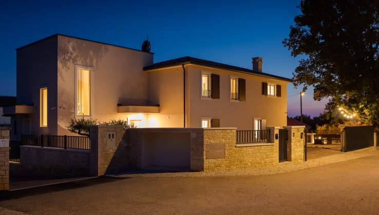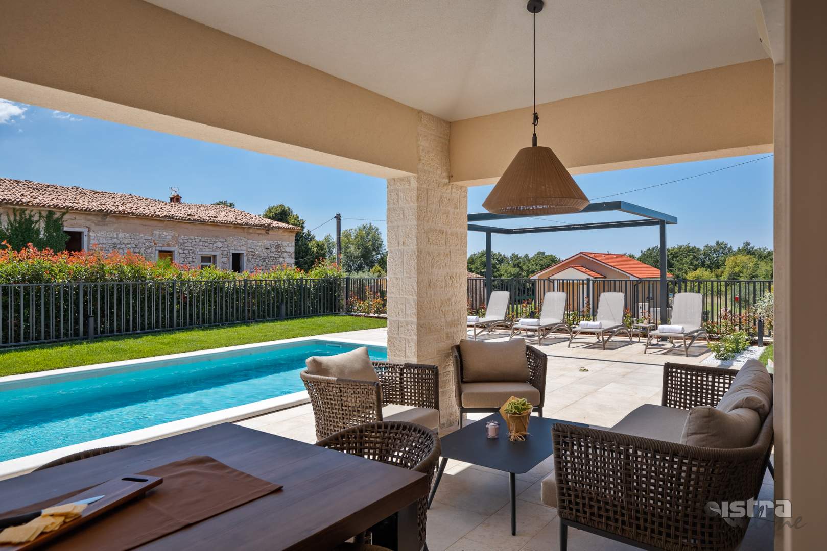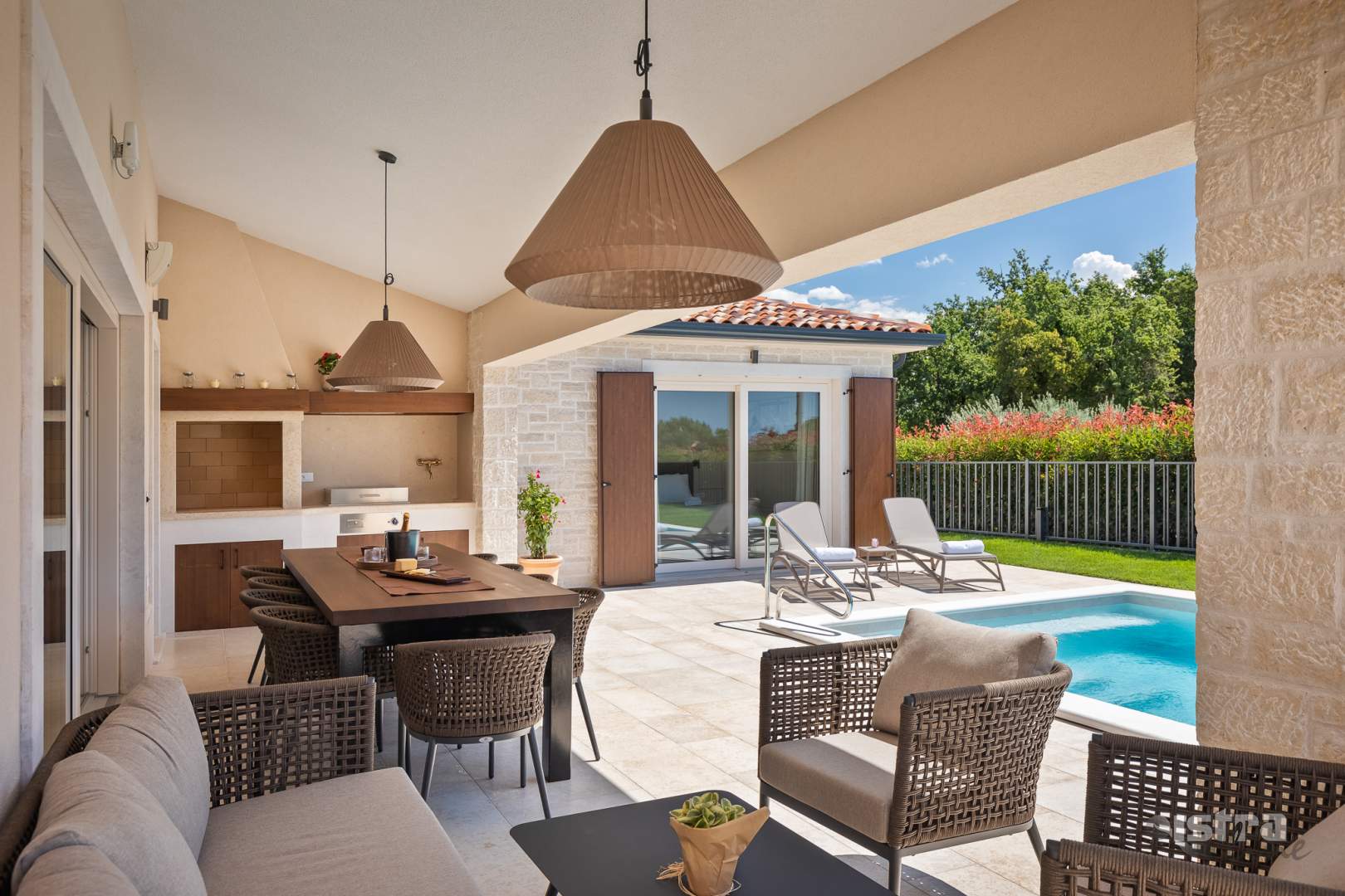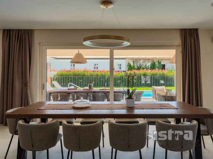 Villa Maxime is a beautiful, modern holiday home in the quiet village of Nova Vas, just 5 kilometers from the beach and a 10-minute drive from Porec. This beautiful villa perfectly combines comfort and elegance and is the ideal place for a relaxing holiday. The villa is located on a fenced plot of 750 m² and offers a wide range of activities to meet the needs of every guest. A 36 m² outdoor pool, a covered terrace with a dining area, an outdoor kitchen with a barbecue and a sun deck with sun loungers are just some of the elements that complete the outdoor space. Within the fenced property, parking for 3 vehicles with an electric car socket is provided. A small wellness area with a jacuzzi, sauna, shower and sun loungers on the ground floor with access to the pool and garden provides a special experience.