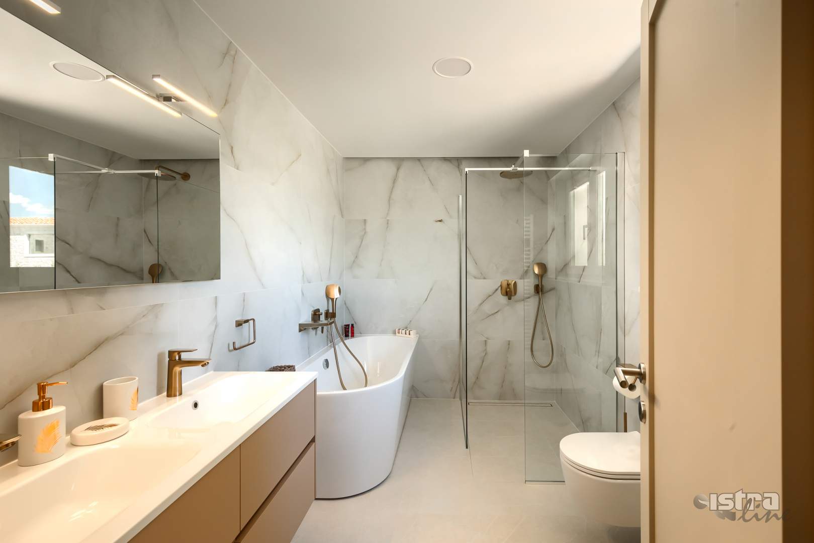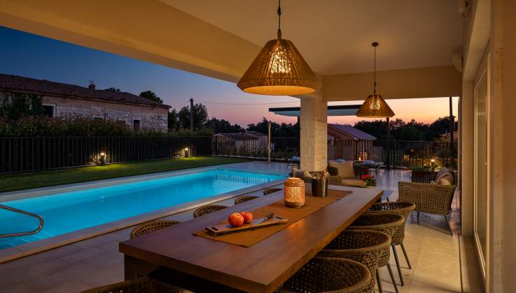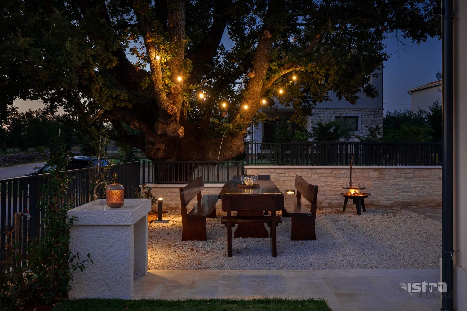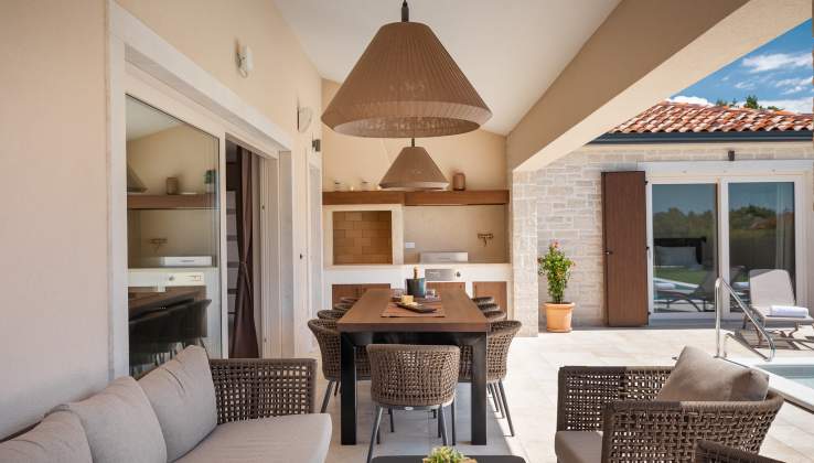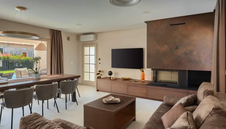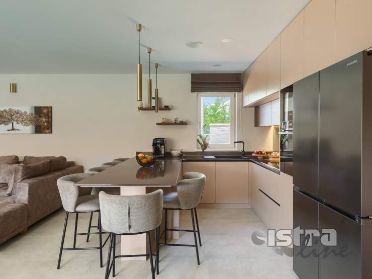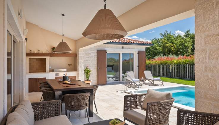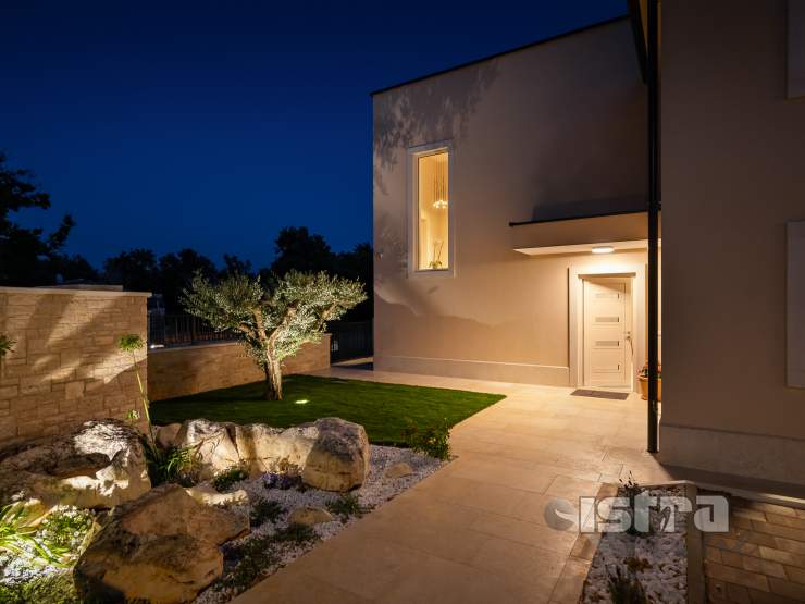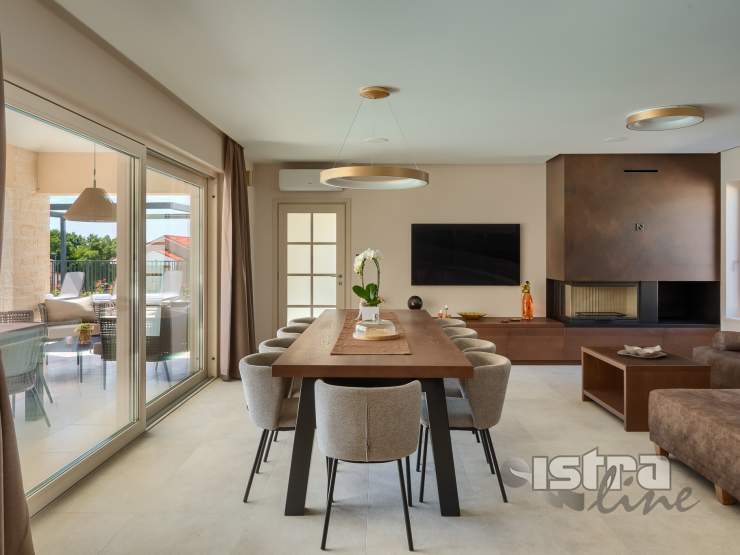 Villa Maxime is a beautiful, modern holiday home in the quiet village of Nova Vas, just 5 kilometers from the beach and a 10-minute drive from Porec. This beautiful villa perfectly combines comfort and elegance and is the ideal place for a relaxing holiday. The villa is located on a fenced plot of 750 m² and offers a wide range of activities to meet the needs of every guest. A 36 m² outdoor pool, a covered terrace with a dining area, an outdoor kitchen with a barbecue and a sun deck with sun loungers are just some of the elements that complete the outdoor space. Within the fenced property, parking for 3 vehicles with an electric car socket is provided. A small wellness area with a jacuzzi, sauna, shower and sun loungers on the ground floor with access to the pool and garden provides a special experience.