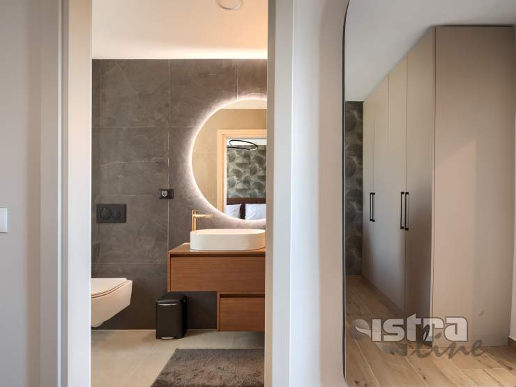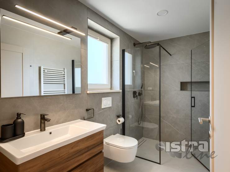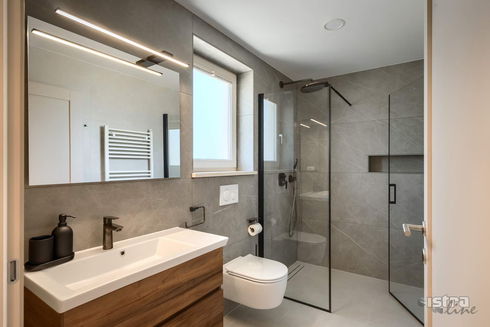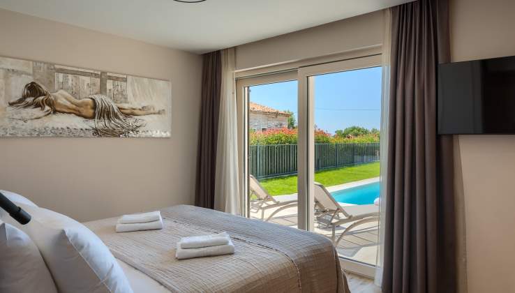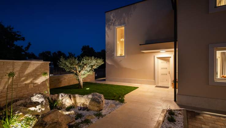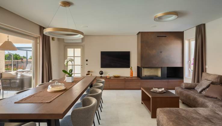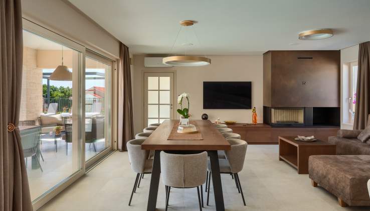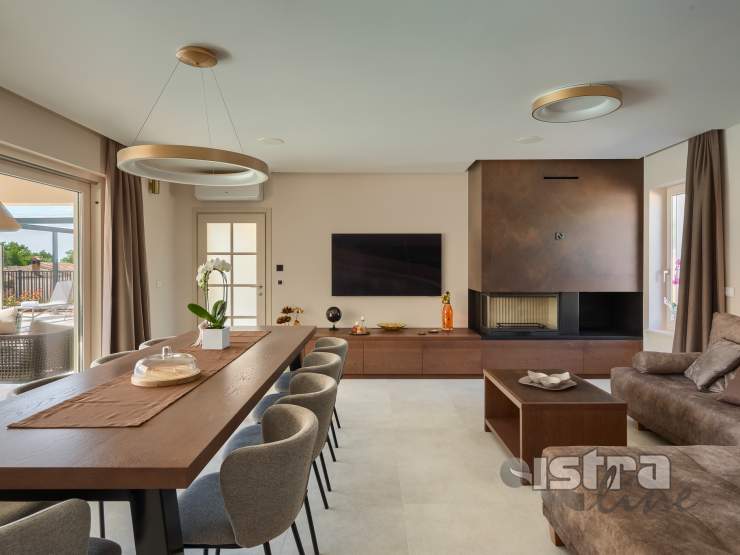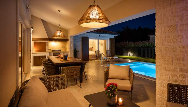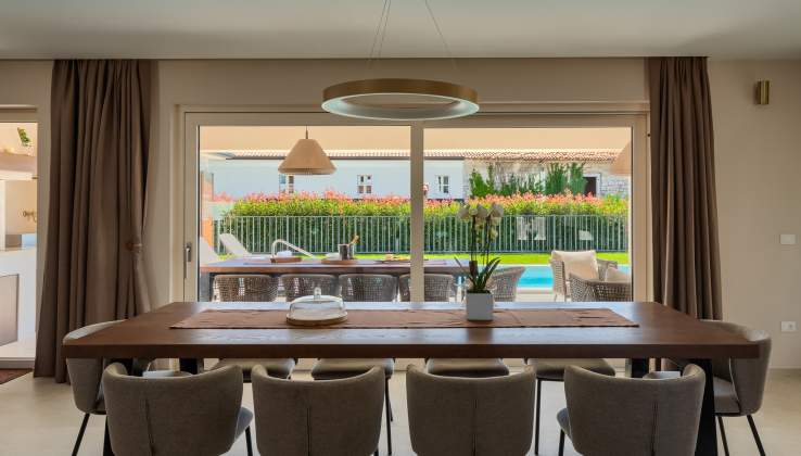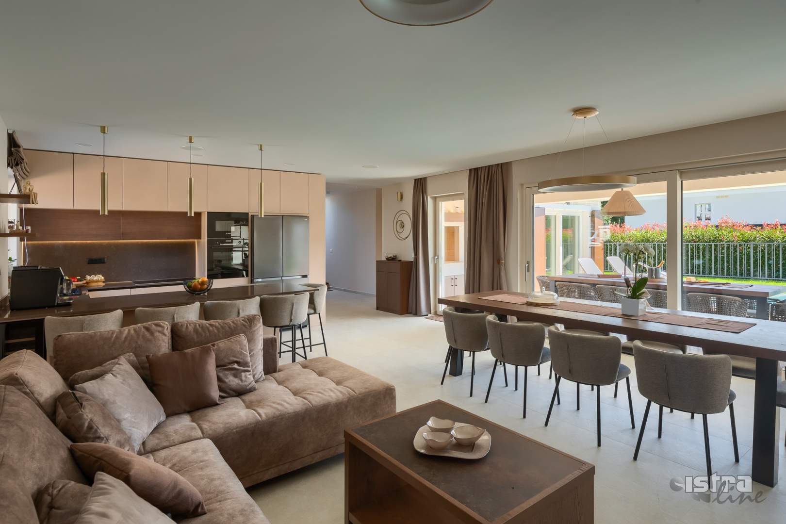 Villa Maxime is a beautiful, modern holiday home in the quiet village of Nova Vas, just 5 kilometers from the beach and a 10-minute drive from Porec. This beautiful villa perfectly combines comfort and elegance and is the ideal place for a relaxing holiday. The villa is located on a fenced plot of 750 m² and offers a wide range of activities to meet the needs of every guest. A 36 m² outdoor pool, a covered terrace with a dining area, an outdoor kitchen with a barbecue and a sun deck with sun loungers are just some of the elements that complete the outdoor space. Within the fenced property, parking for 3 vehicles with an electric car socket is provided. A small wellness area with a jacuzzi, sauna, shower and sun loungers on the ground floor with access to the pool and garden provides a special experience.