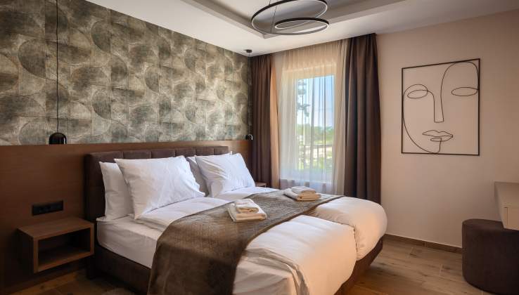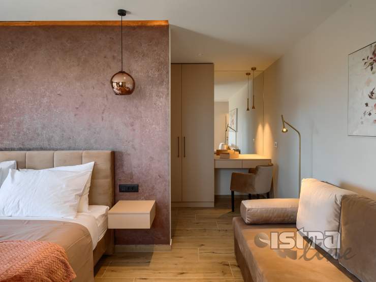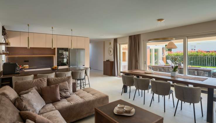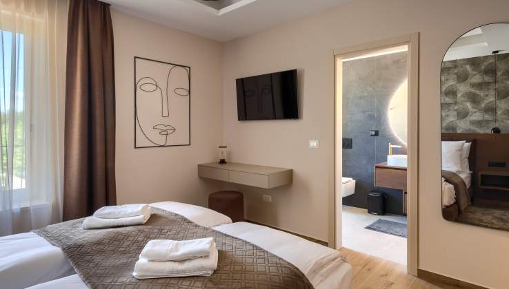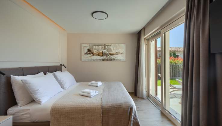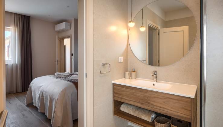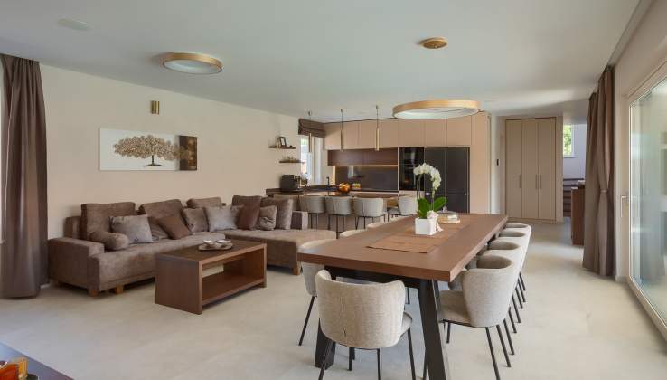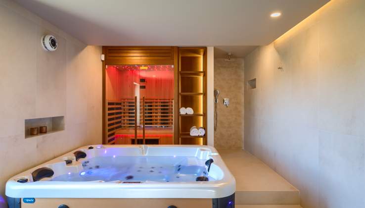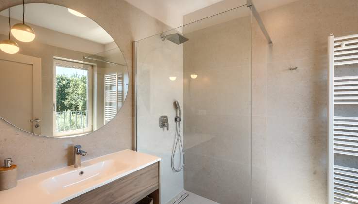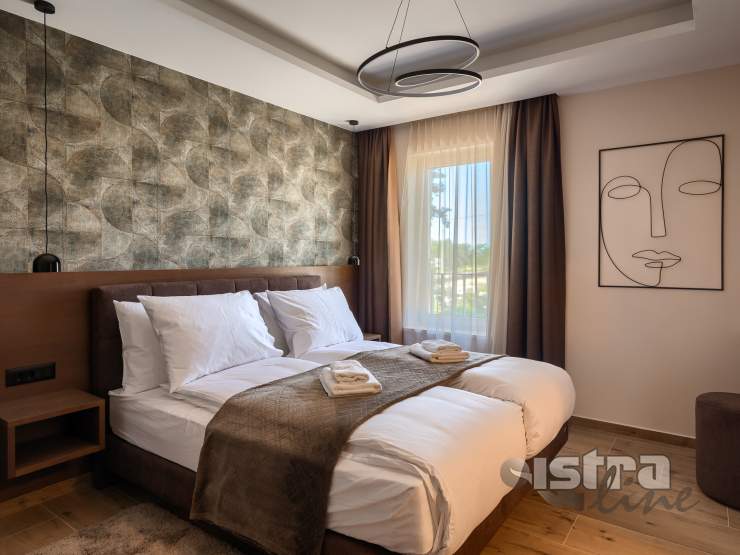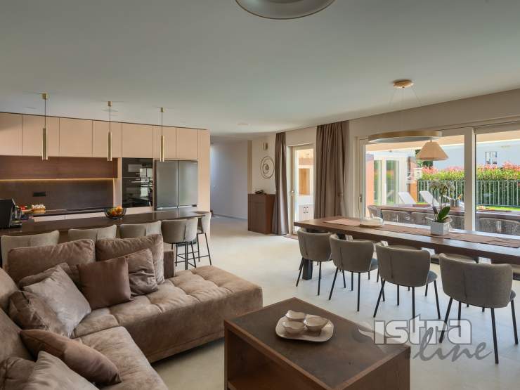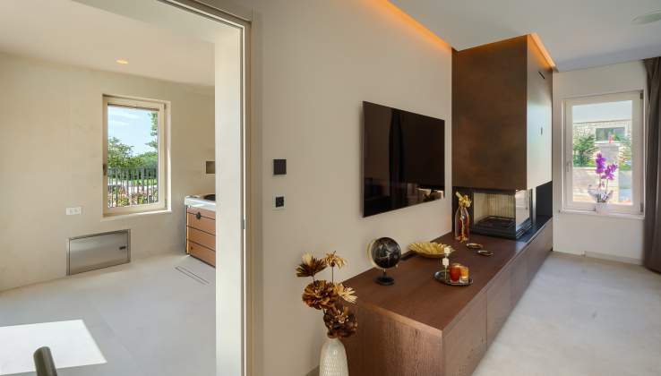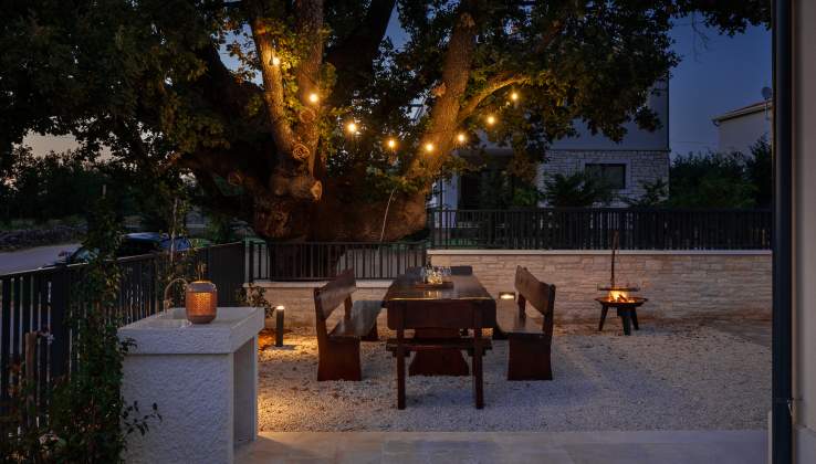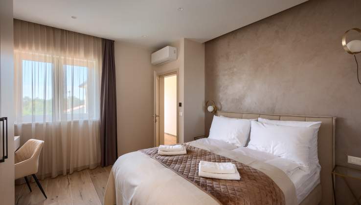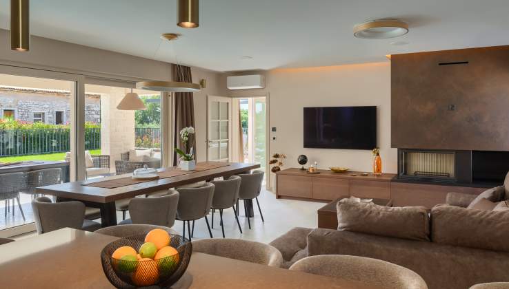 Villa Maxime is a beautiful, modern holiday home in the quiet village of Nova Vas, just 5 kilometers from the beach and a 10-minute drive from Porec. This beautiful villa perfectly combines comfort and elegance and is the ideal place for a relaxing holiday. The villa is located on a fenced plot of 750 m² and offers a wide range of activities to meet the needs of every guest. A 36 m² outdoor pool, a covered terrace with a dining area, an outdoor kitchen with a barbecue and a sun deck with sun loungers are just some of the elements that complete the outdoor space. Within the fenced property, parking for 3 vehicles with an electric car socket is provided. A small wellness area with a jacuzzi, sauna, shower and sun loungers on the ground floor with access to the pool and garden provides a special experience.