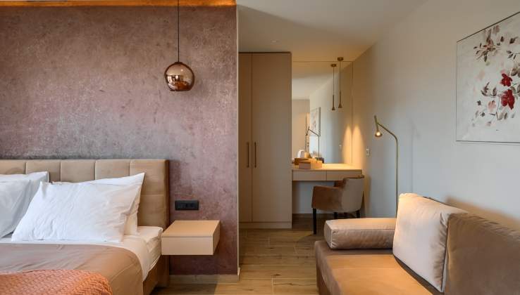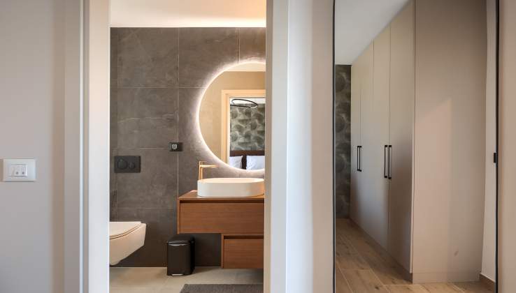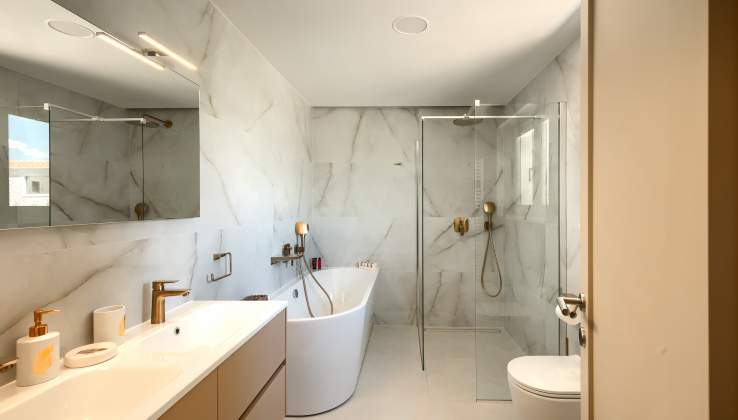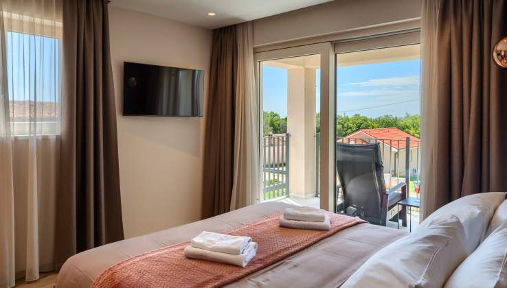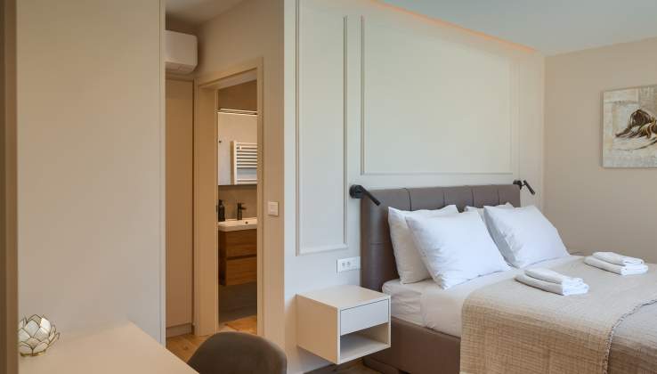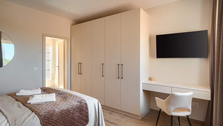 Villa Maxime is spread over two air-conditioned floors with a total area of 220 m² and can accommodate up to 8 persons. On the ground floor there is a modernly furnished living room with plenty of natural light entering through large glass walls, an elegant dining room and a fully equipped kitchen. A bedroom with en suite bathroom and a separate toilet are also located on the ground floor. Upstairs, this beautiful villa offers three more bedrooms, each with its own bathroom, one of which has access to a balcony with a torram seating area and panoramic sea views.