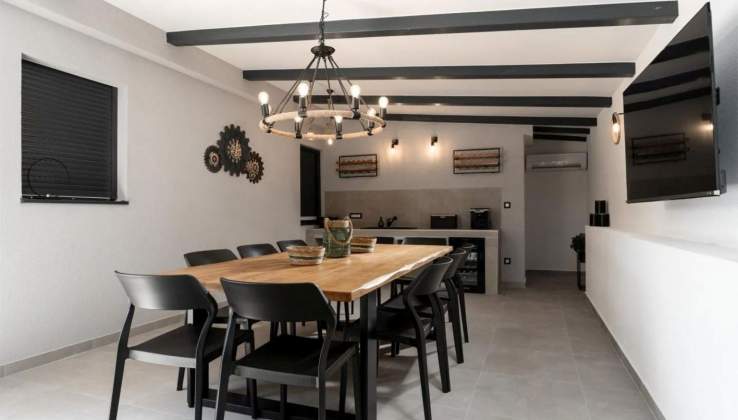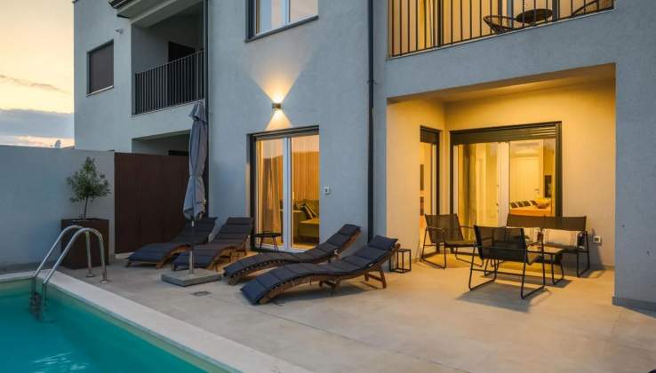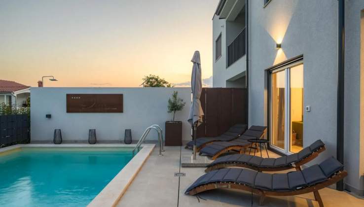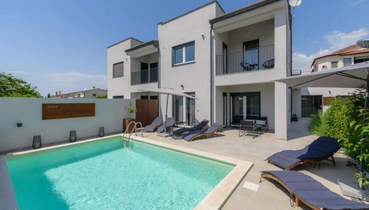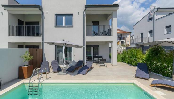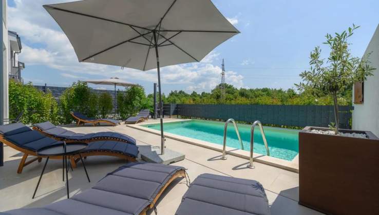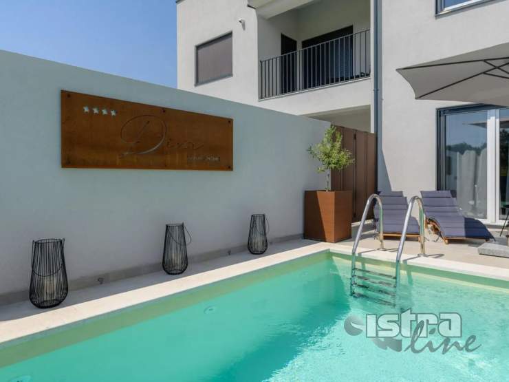 Vila Diva Exclusive je prekrasna, moderna kuća za odmor smještena u mirnom selu Nova Vas, samo 5 kilometara od plaže i 10 minuta vožnje od Poreča. Ova prekrasna vila savršeno spaja udobnost i eleganciju te je idealno mjesto za opuštajući odmor. Vila se nalazi na ograđenom zemljištu od 350 m² i nudi brojne sadržaje kako bi zadovoljila potrebe svakog gosta. Vanjski bazen od 24 m², ležaljke, vanjski tuš i prostrana ljetna kuhinja s velikim stolom za druženje, satelitskom televizijom i roštiljem samo su neki od sadržaja koji upotpunjuju vanjski prostor.
